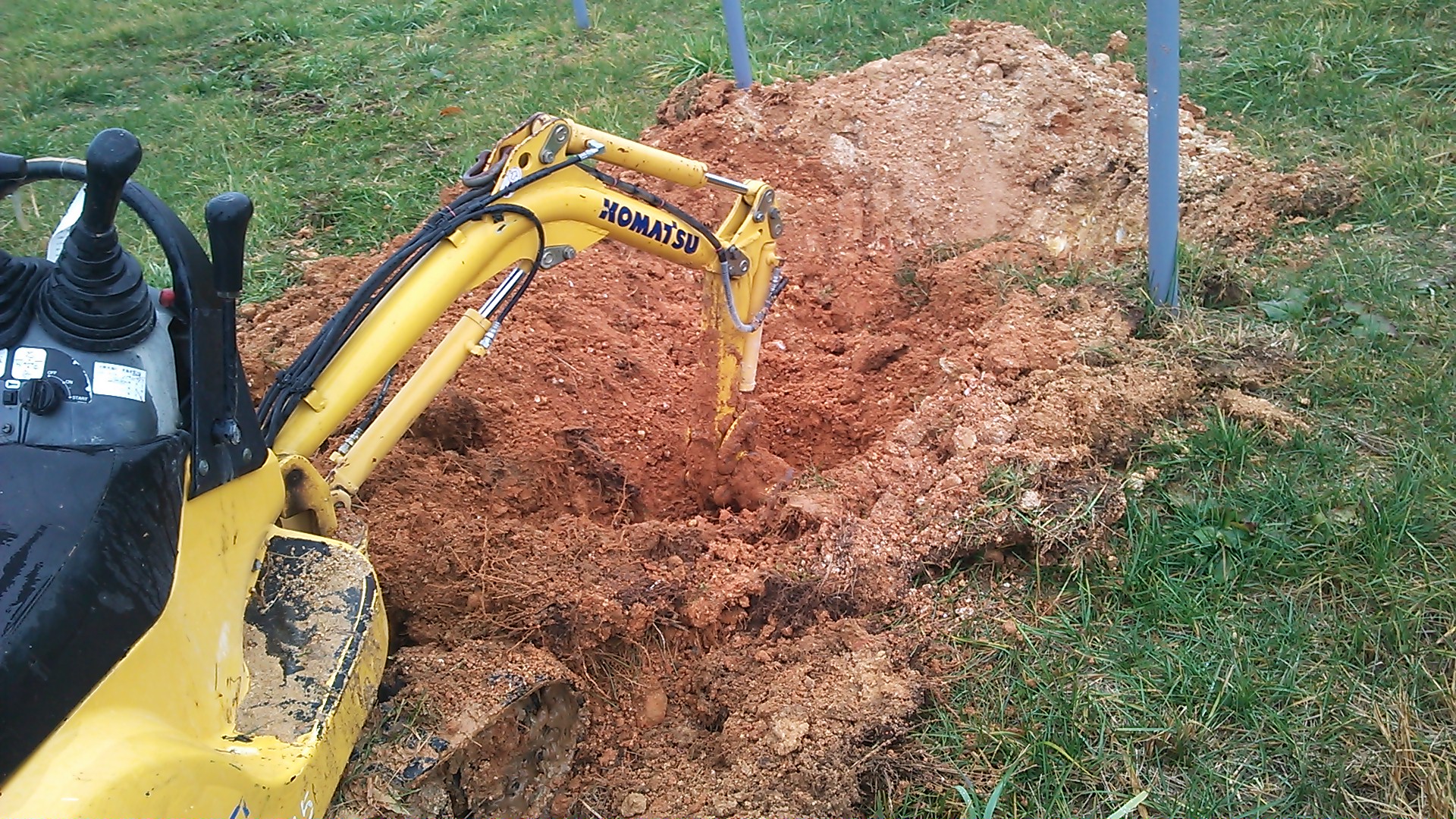 実際に掘ってみましたが、バケットが小さい・・・ これは時間がかなり掛かると途方もなさを感じました。 しかも今日は雨。 穴が掘り終わると根性がかなりついていると期待します。 根性!根性!