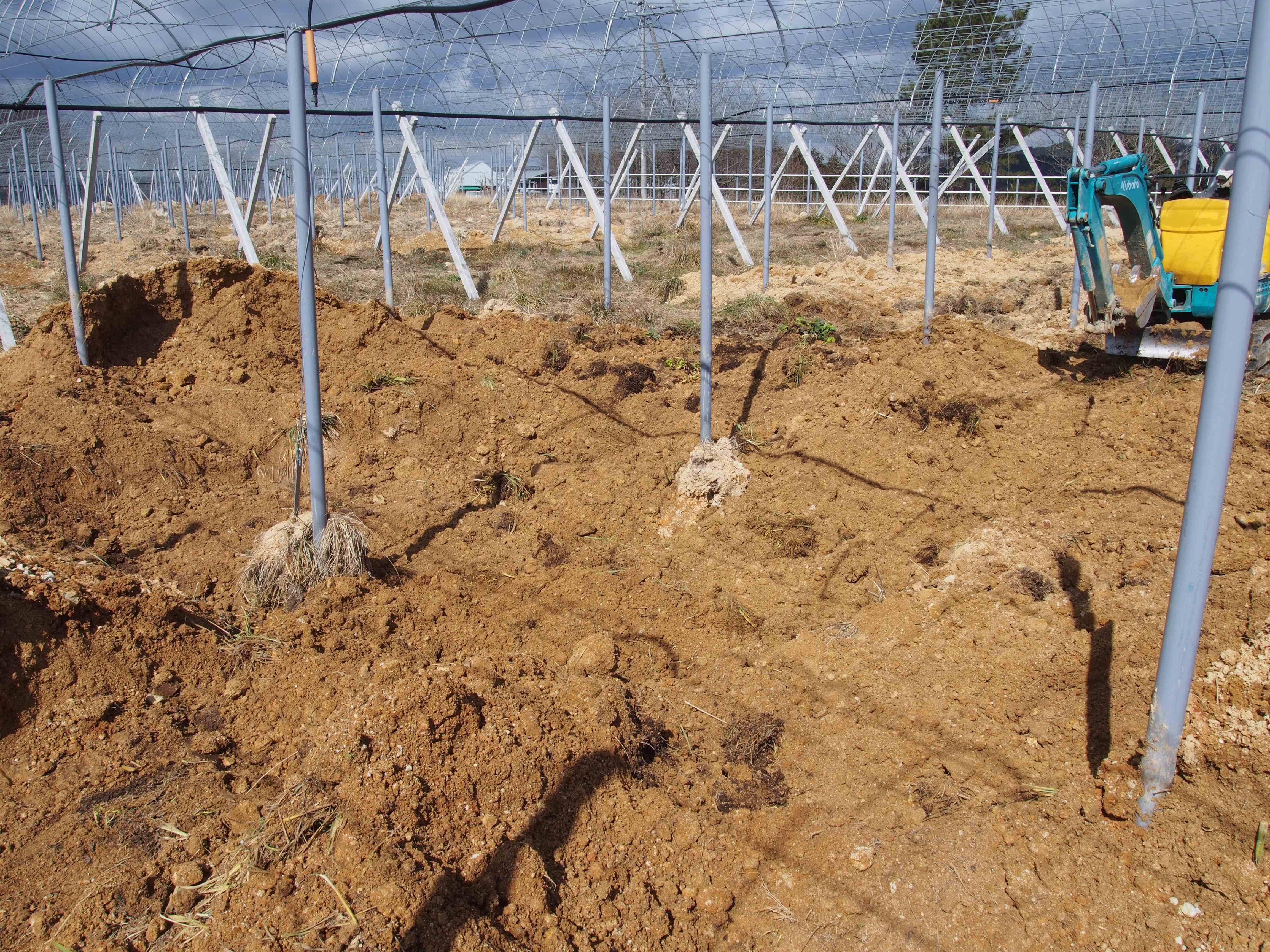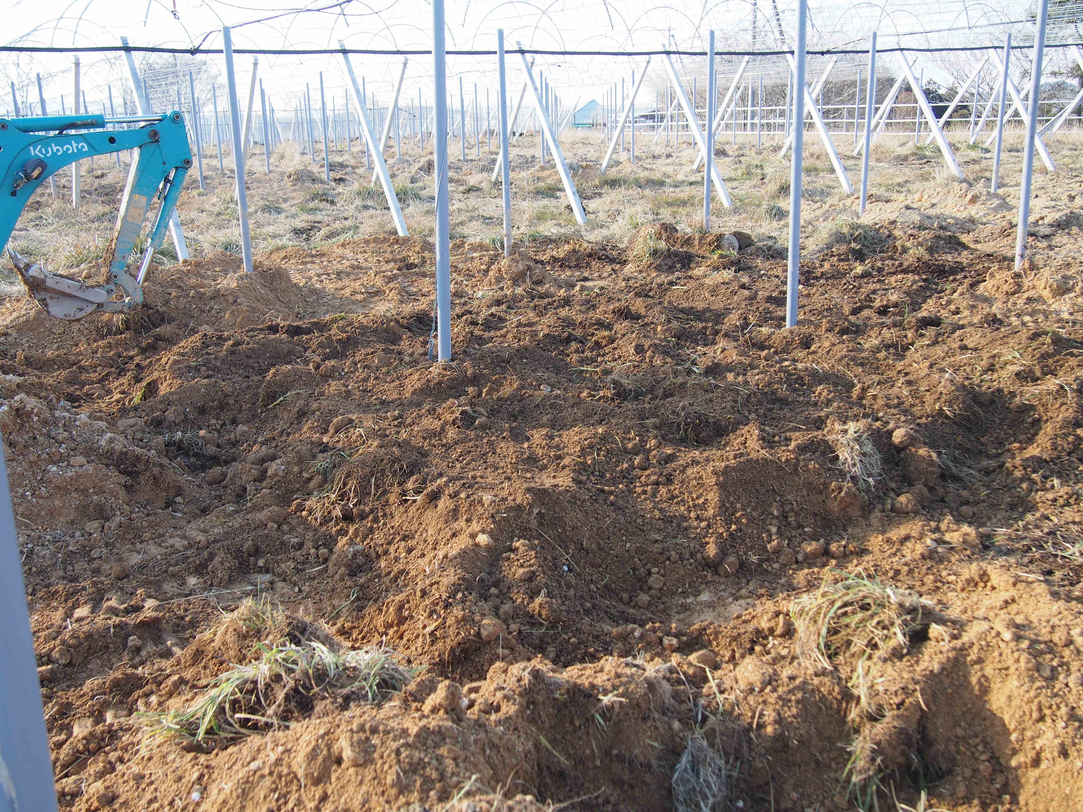 3m×3mの大きさで深さ1m以上の植穴を堆肥500kgと土を混ぜながら戻すのはスコップではできませんので、ユンボを使用します。