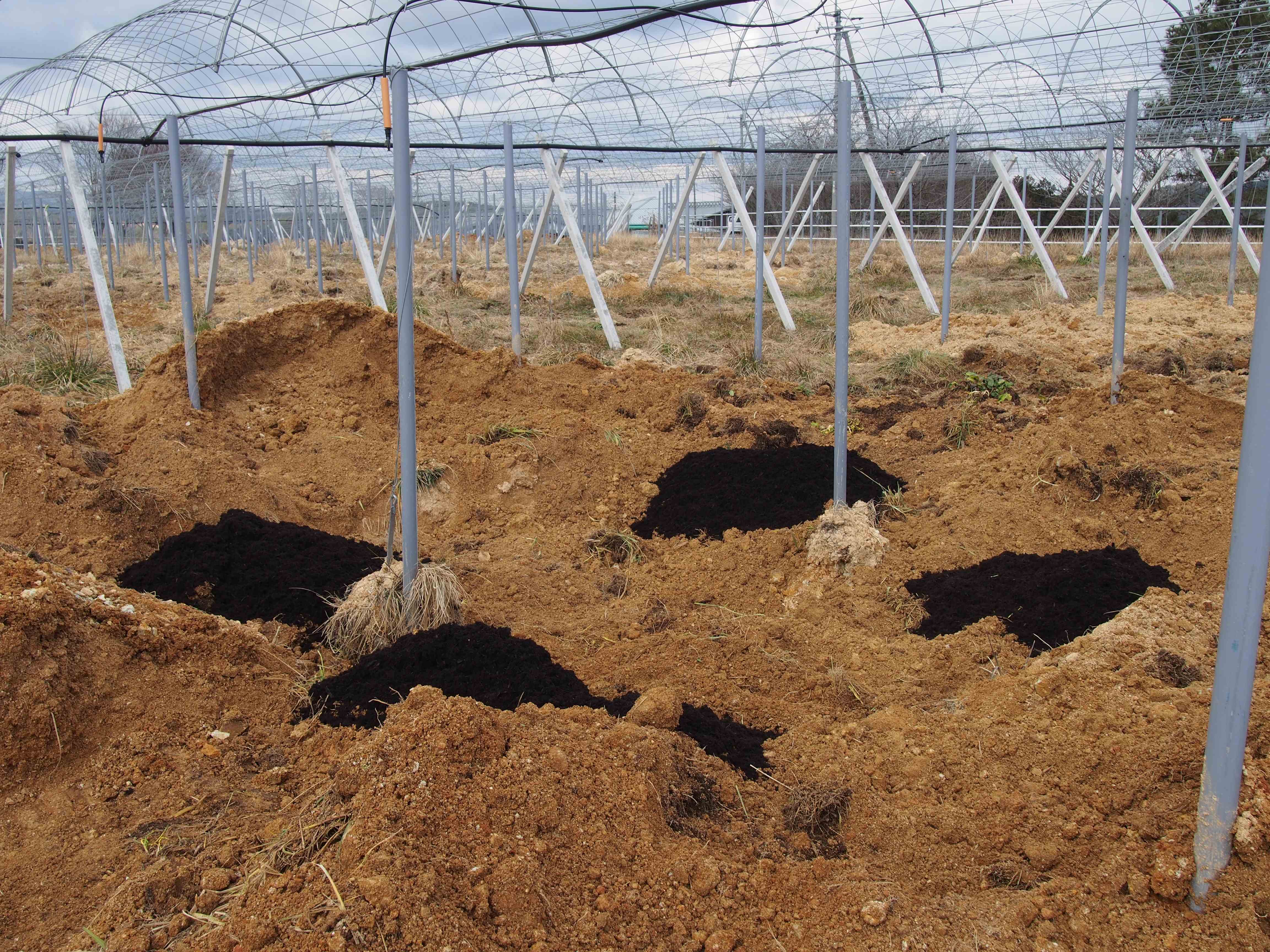 肥料は本来この地点で一緒に混ぜておきますが、最初の植穴の2m×2mの範囲のみに混ぜることもできないので、別の日に混ぜることにします。