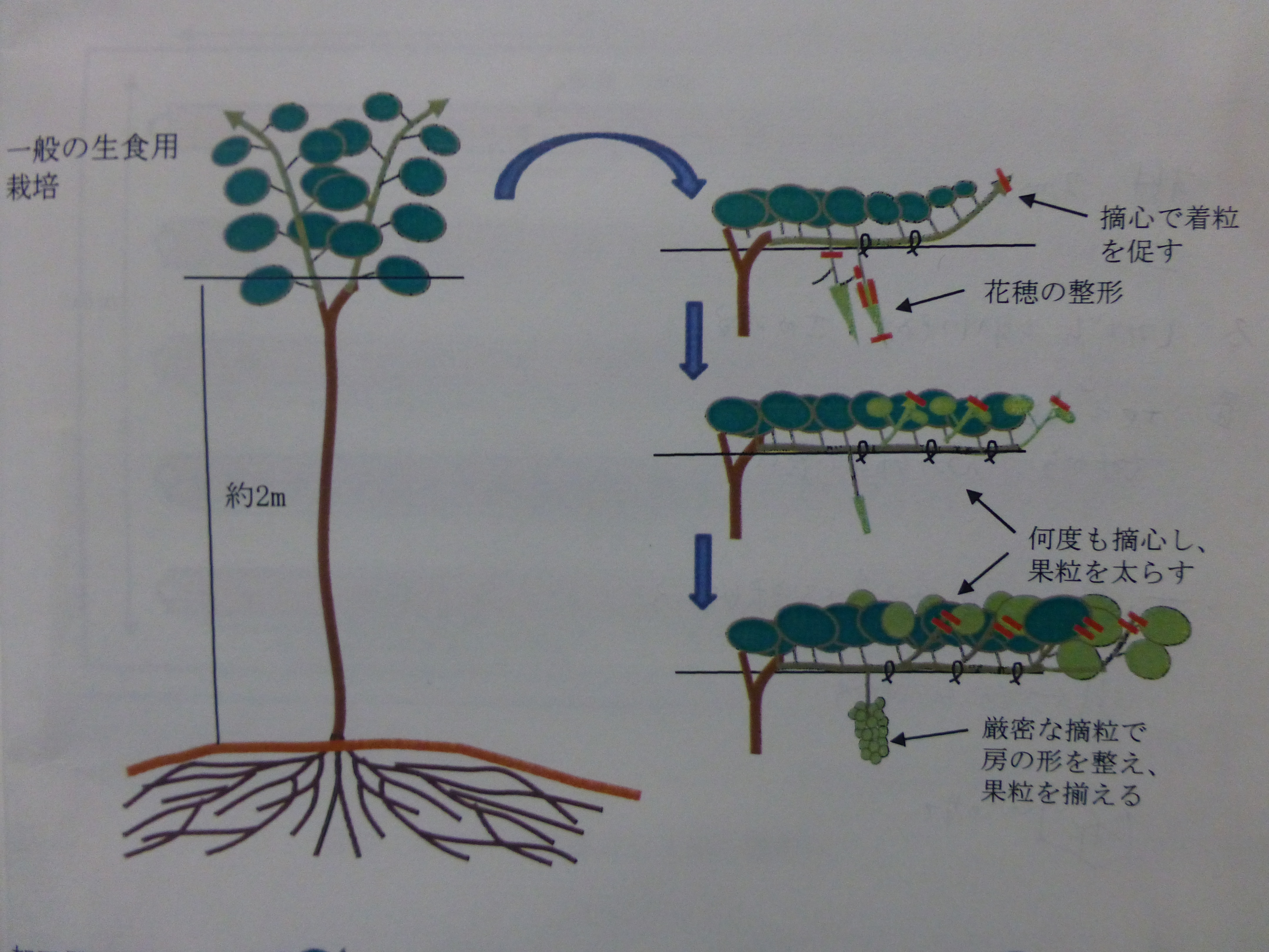 新梢を誘因し棚に取付け摘心を繰り返し、人の顔から頭の高さで房を作る手間の掛かるやり方です。