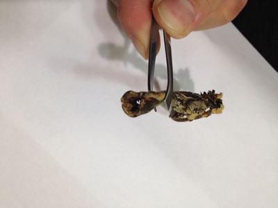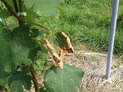 よく見てみると 茎の中が何者かに浸食され、それが原因で生長点が枯れている模様・・・。