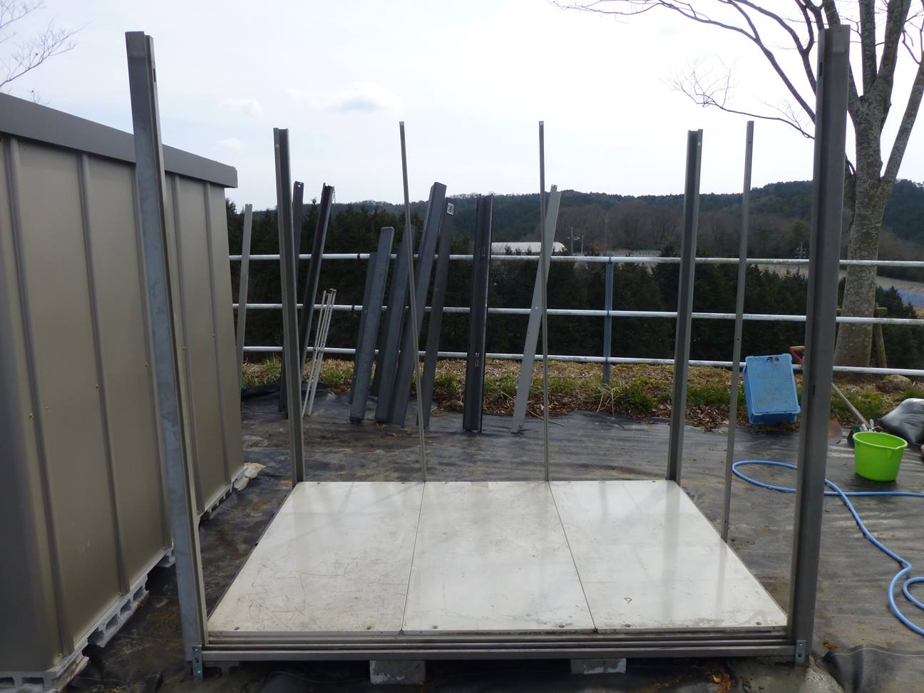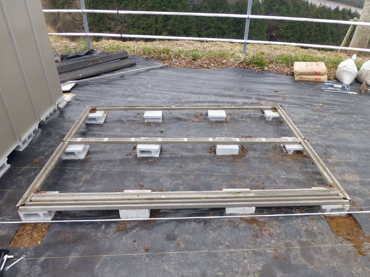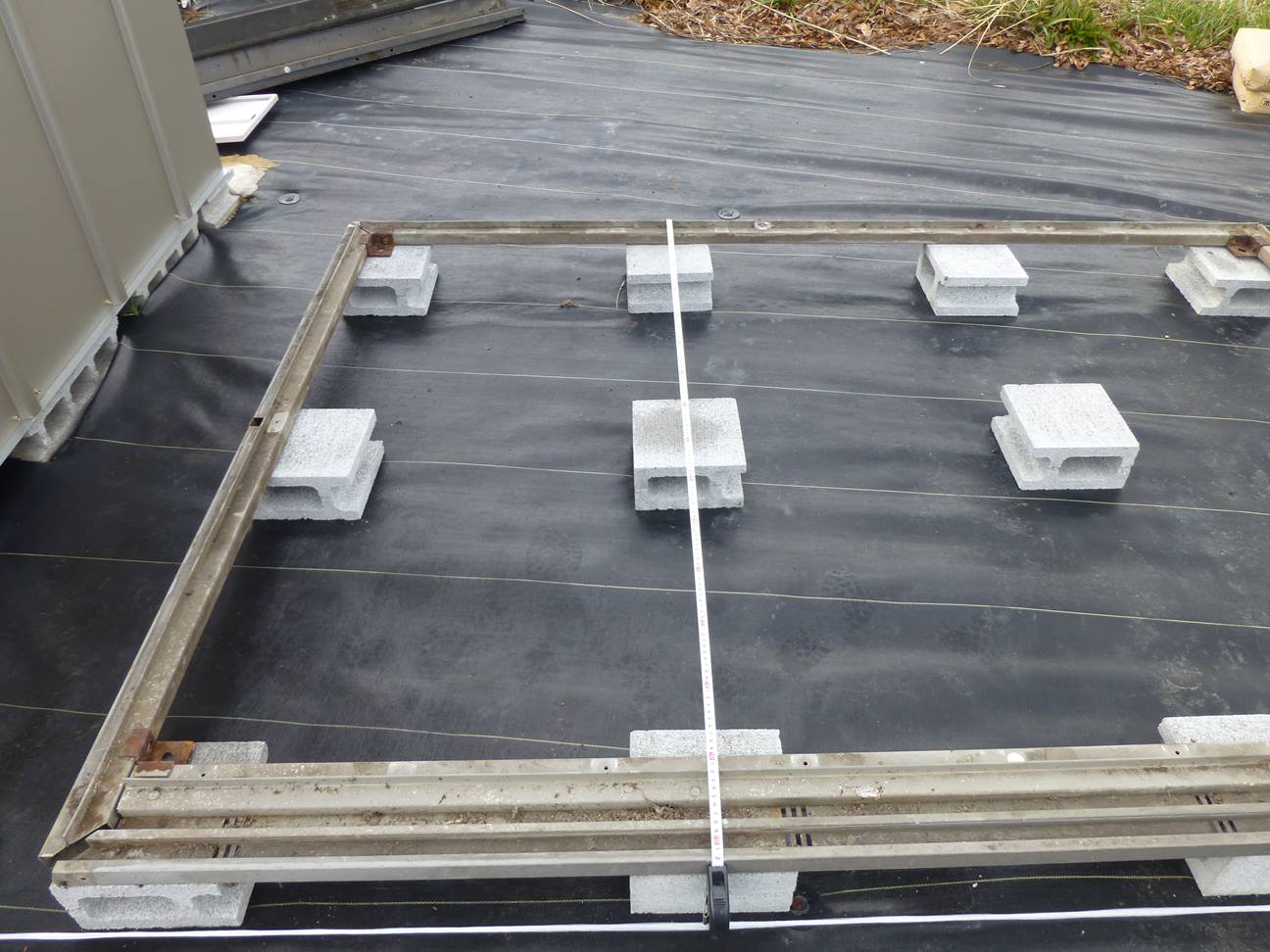 正確なベースブロックの位置を決めるため、物置の枠を組立ます。