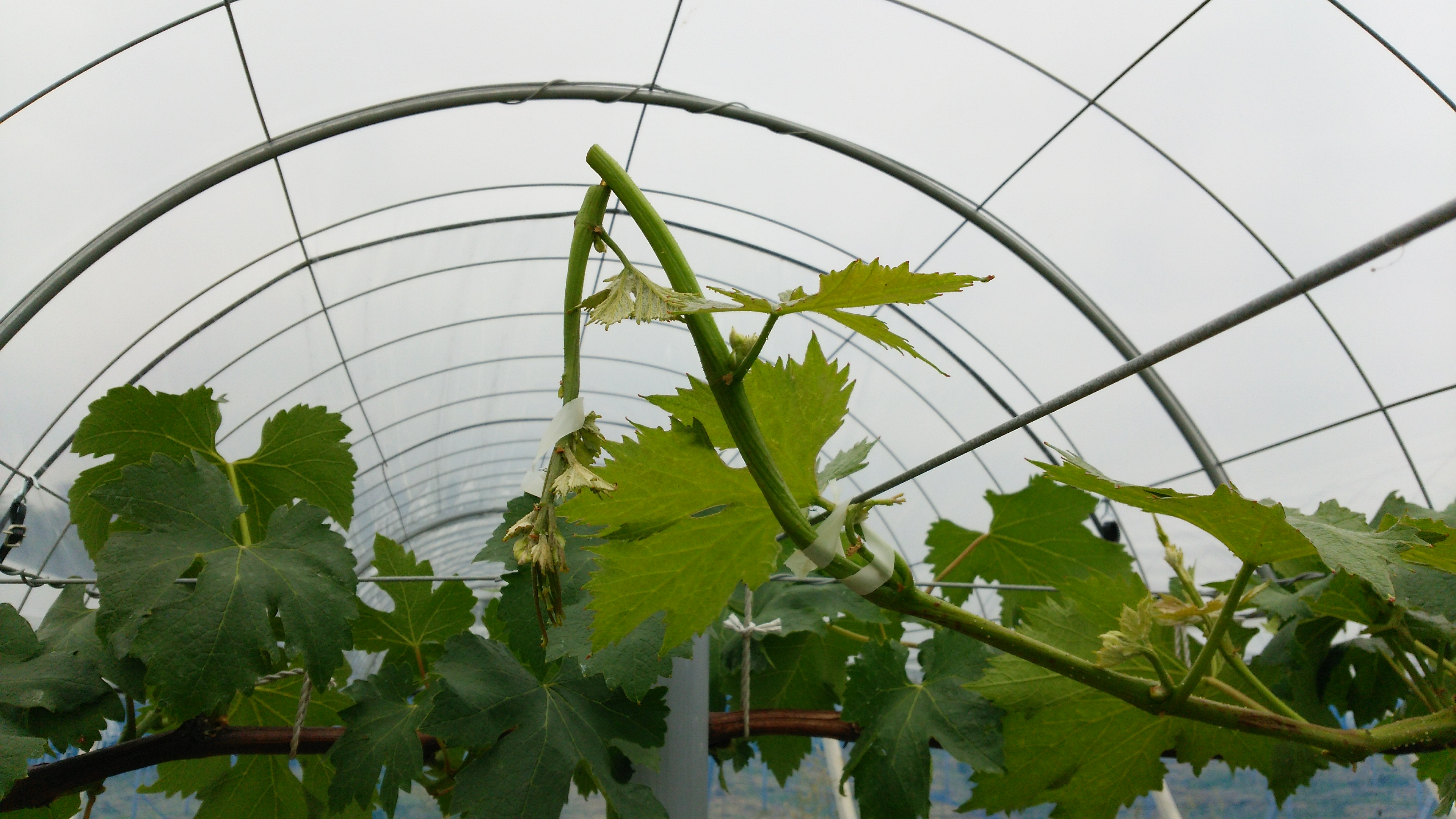 延長主枝からねじれ防止用に副梢を伸ばす。
