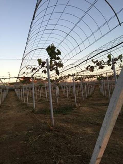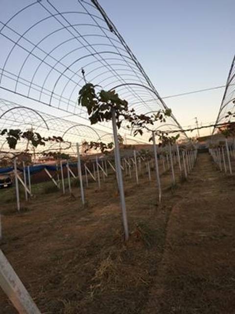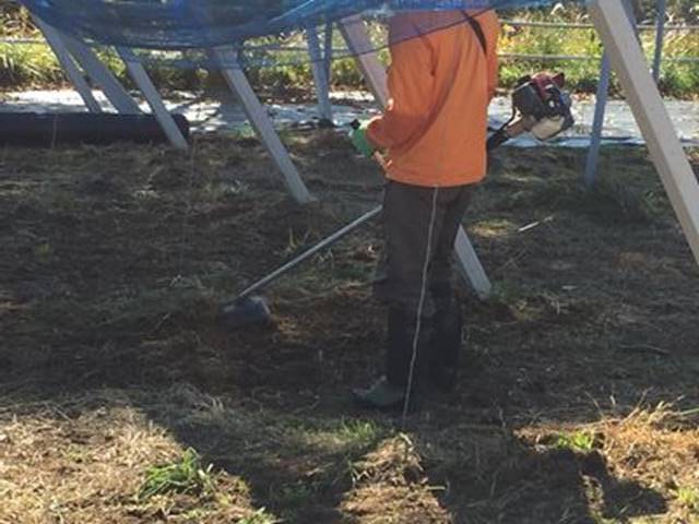 圃場周囲の防草シートを敷く為、株周りの雑草を 秀吉さんが