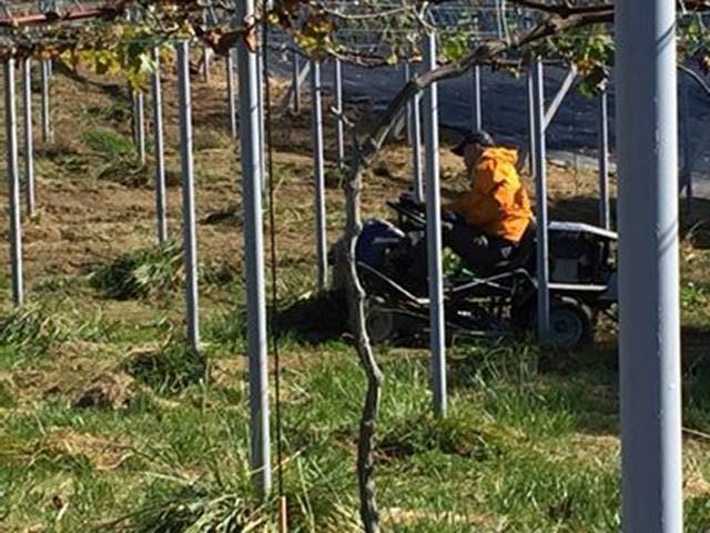 まずは新一郎さんが乗用草刈り機で大きい方の圃場の草刈り。