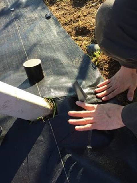 柱に合わせて切れ目を入れ、防草シート用テープで張り合わせます。