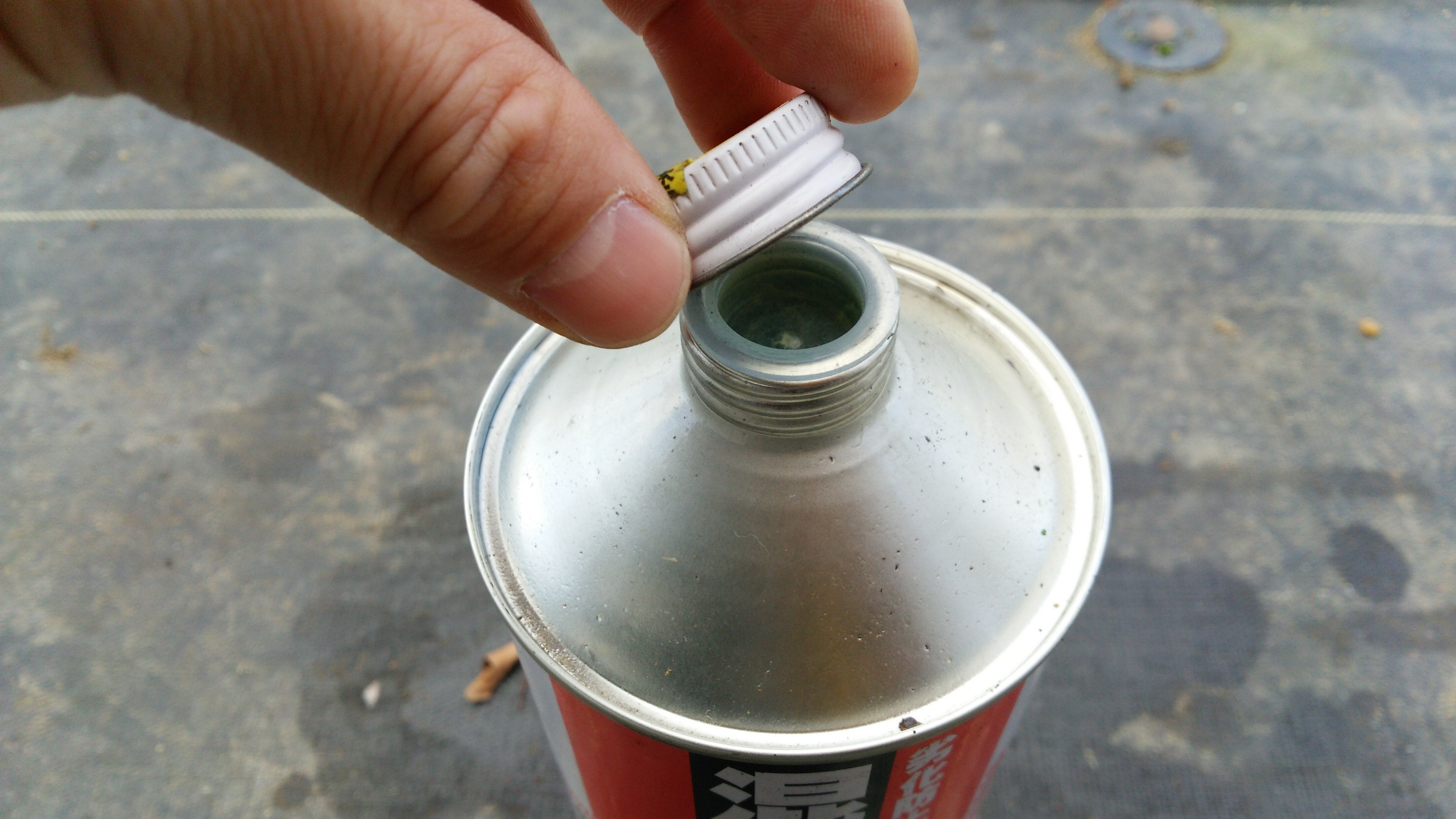 ③入れ終わったらキャップを閉めるが、気化を防ぐプラスチック栓が付いているので、これを先に入れる。