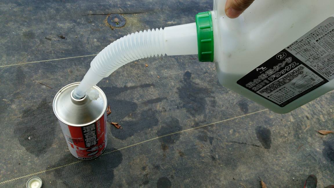 ②混合計量タンクの口を給油ノズル(ホース)へ変更し、混合燃料缶に入れる。
