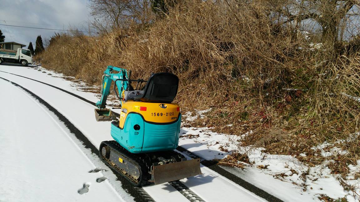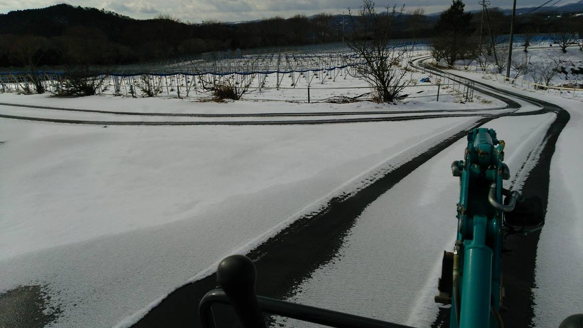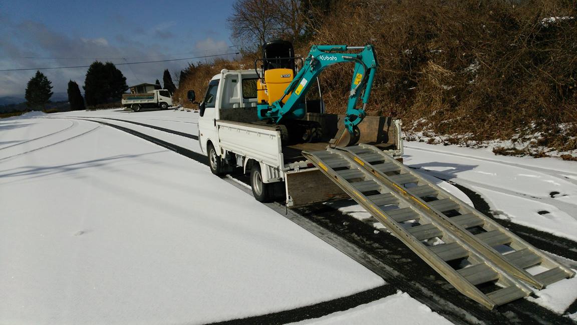 トラックを借りてユンボを運んでいたが、途中から雪景色。