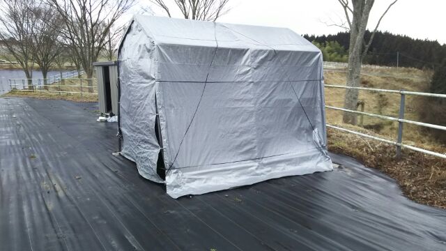 まずは、またも運搬車車庫のビニールが風で飛んでしまっているので取り付け直しから。