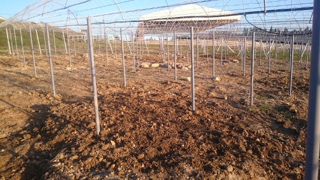 ユンボで穴を掘り、堆肥を運搬した状態。支柱があるので、樹を植える場所を衷心にH型の穴の開いている状態です。
