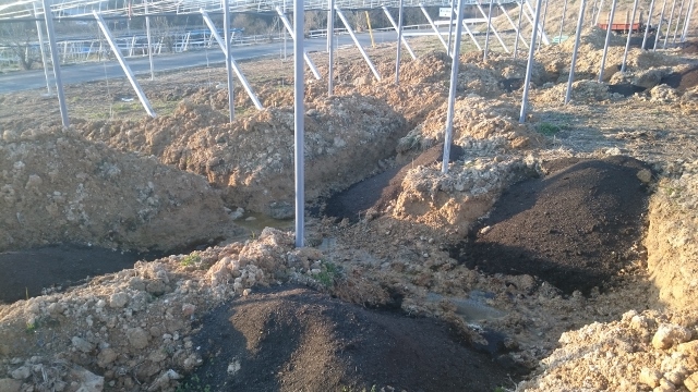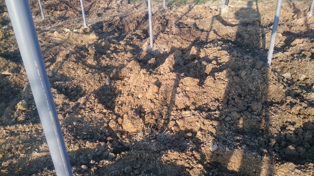 ユンボで穴を掘り、堆肥を運搬した状態。支柱があるので、樹を植える場所を衷心にH型の穴の開いている状態です。