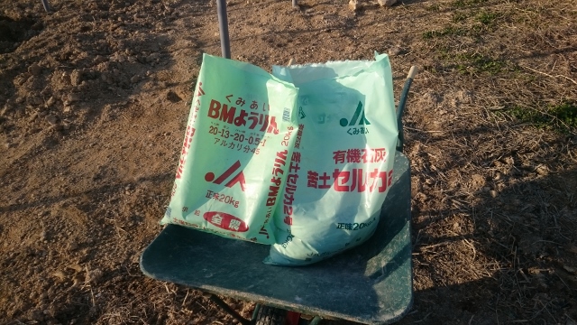 苗の植えつけ用の肥料として、苗1本当たり、苦土セルカ3kg、BMヨウリン2kgを撒きます。
