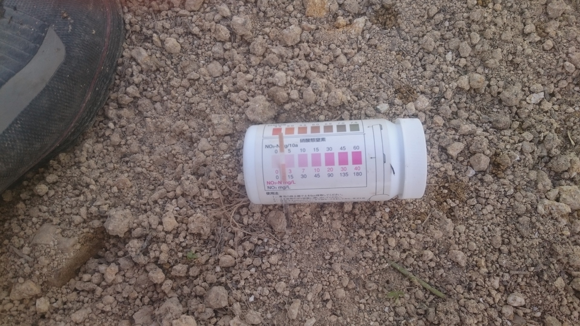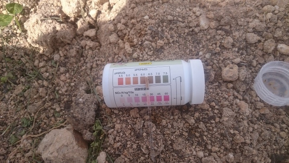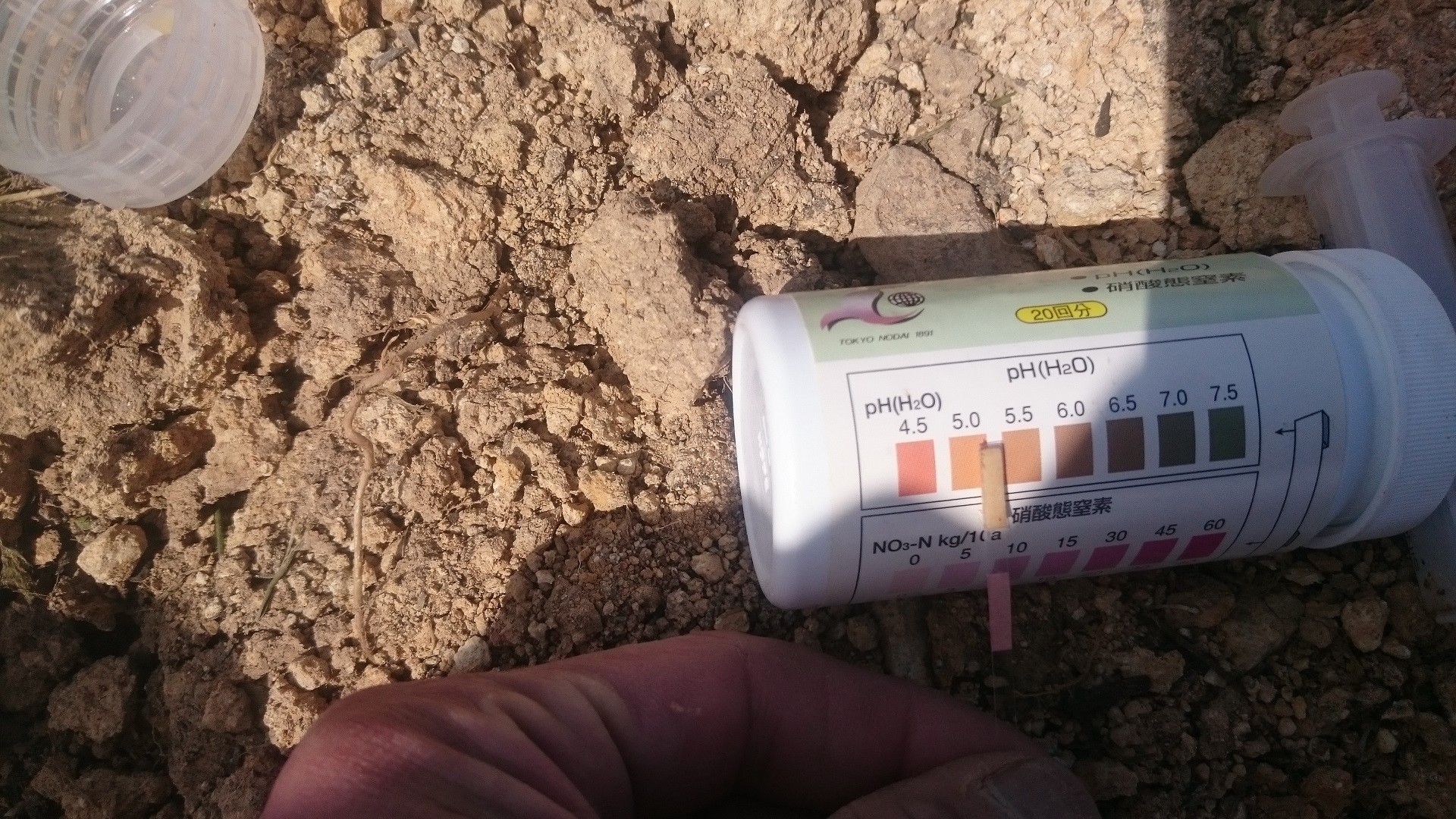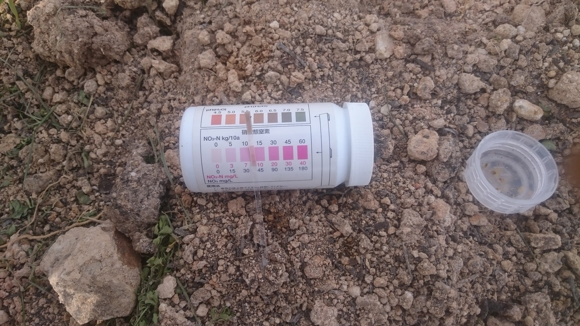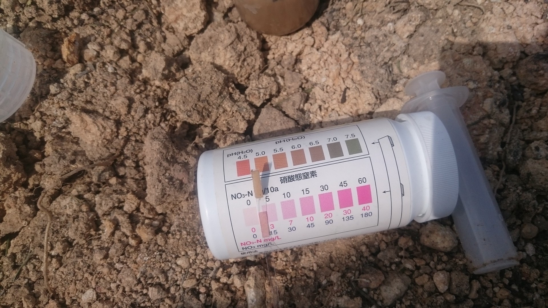 3か所の土を取り、水に溶かしてから、検査紙をその水に漬けます。