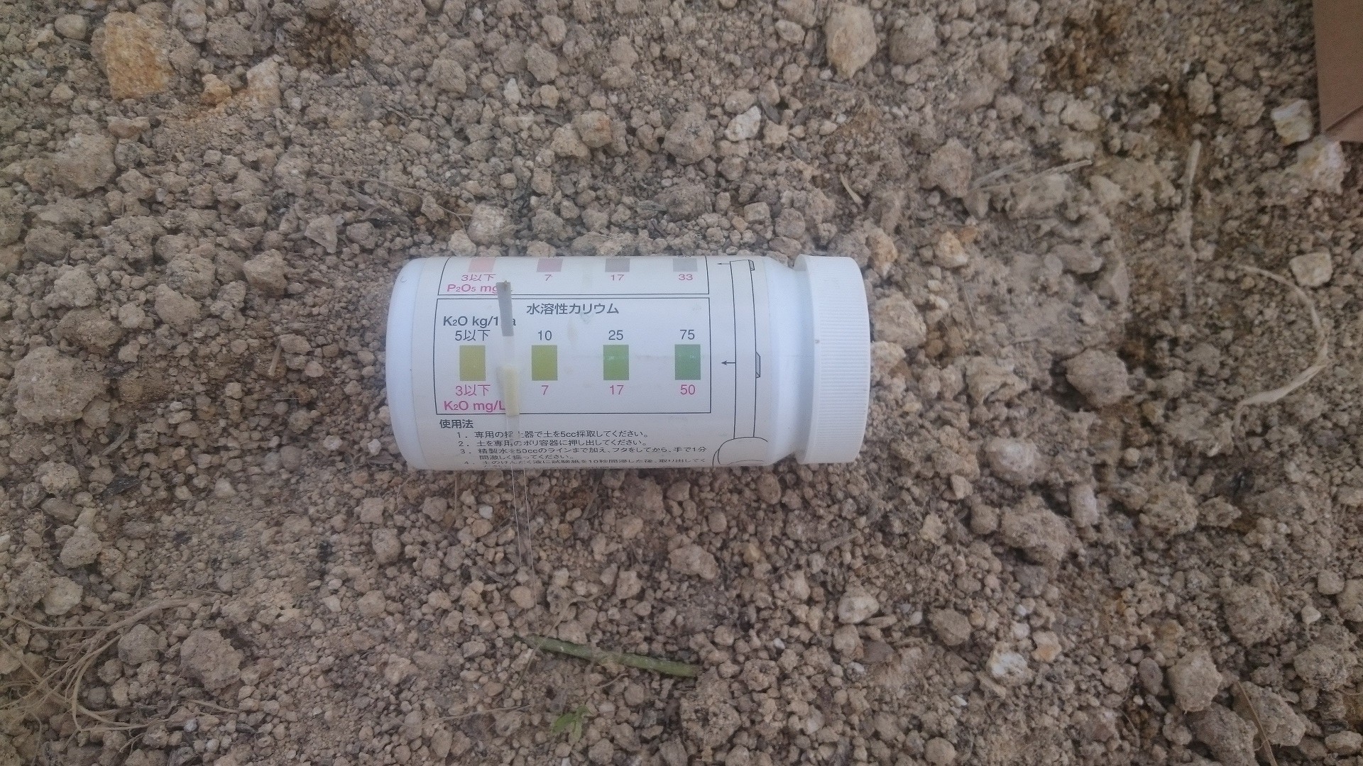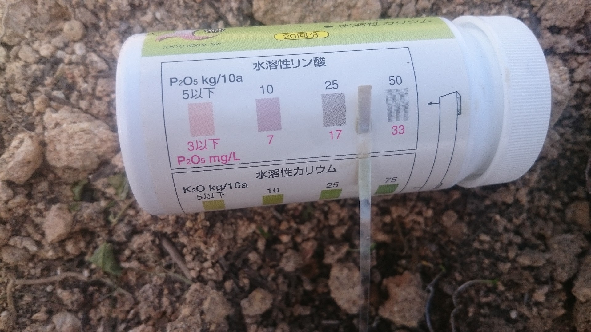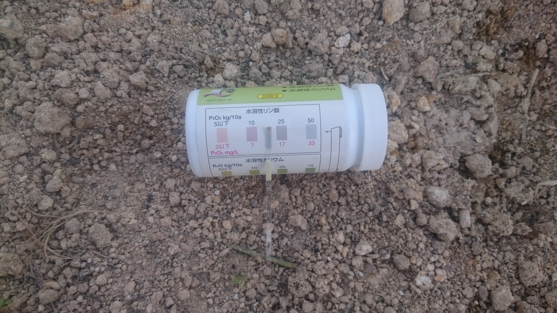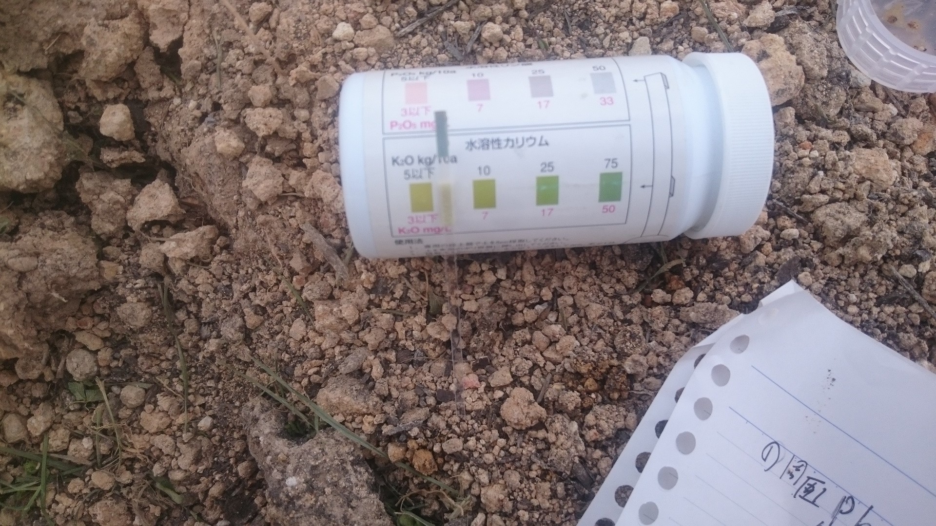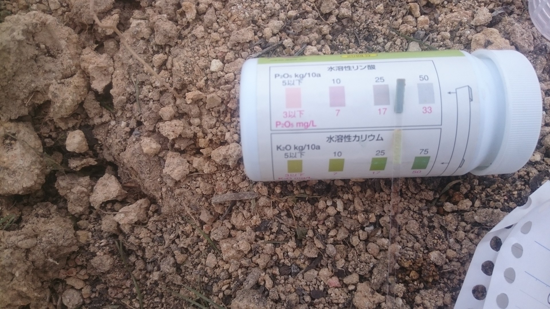 3か所の土を取り、水に溶かしてから、検査紙をその水に漬けます。