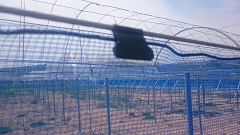 最初の防風ネットを園の周囲のワイヤーに取り付けます。