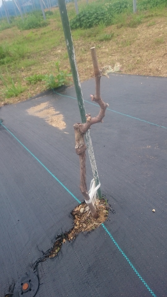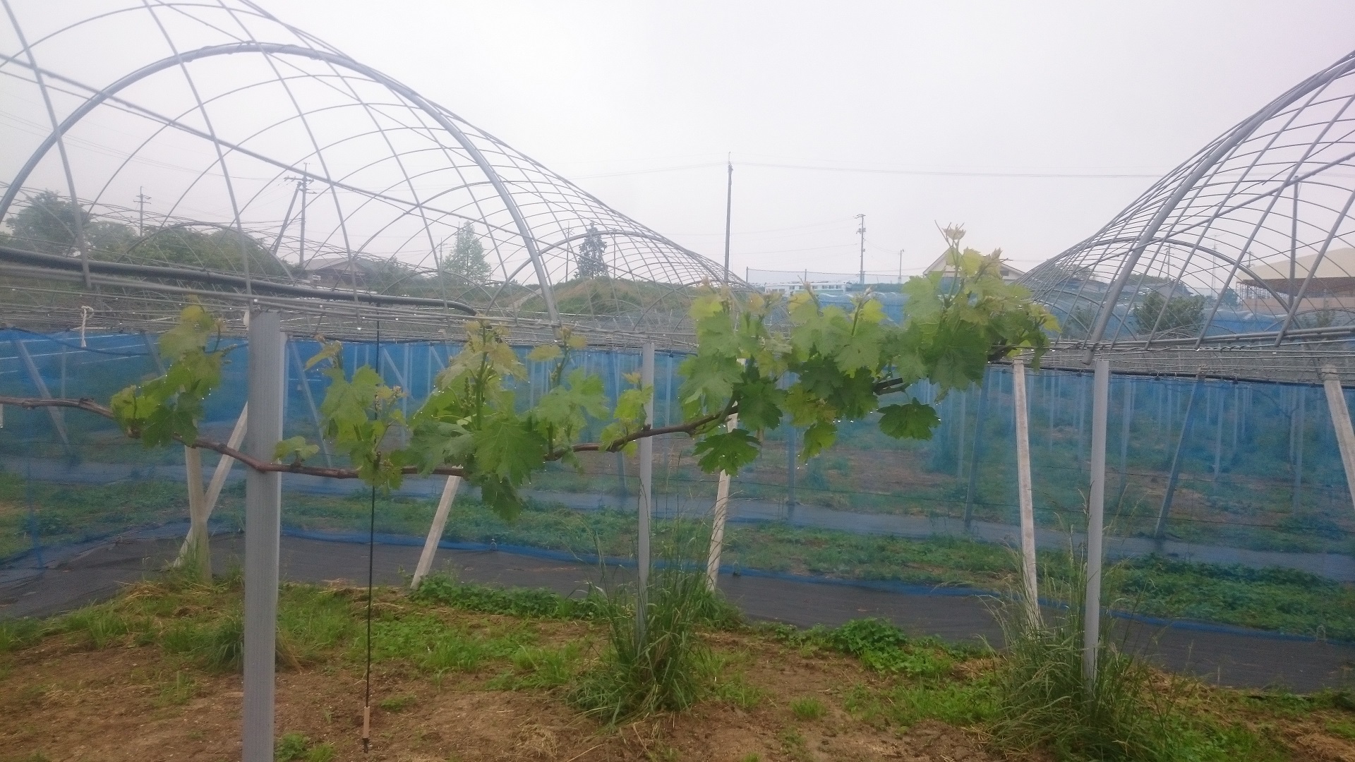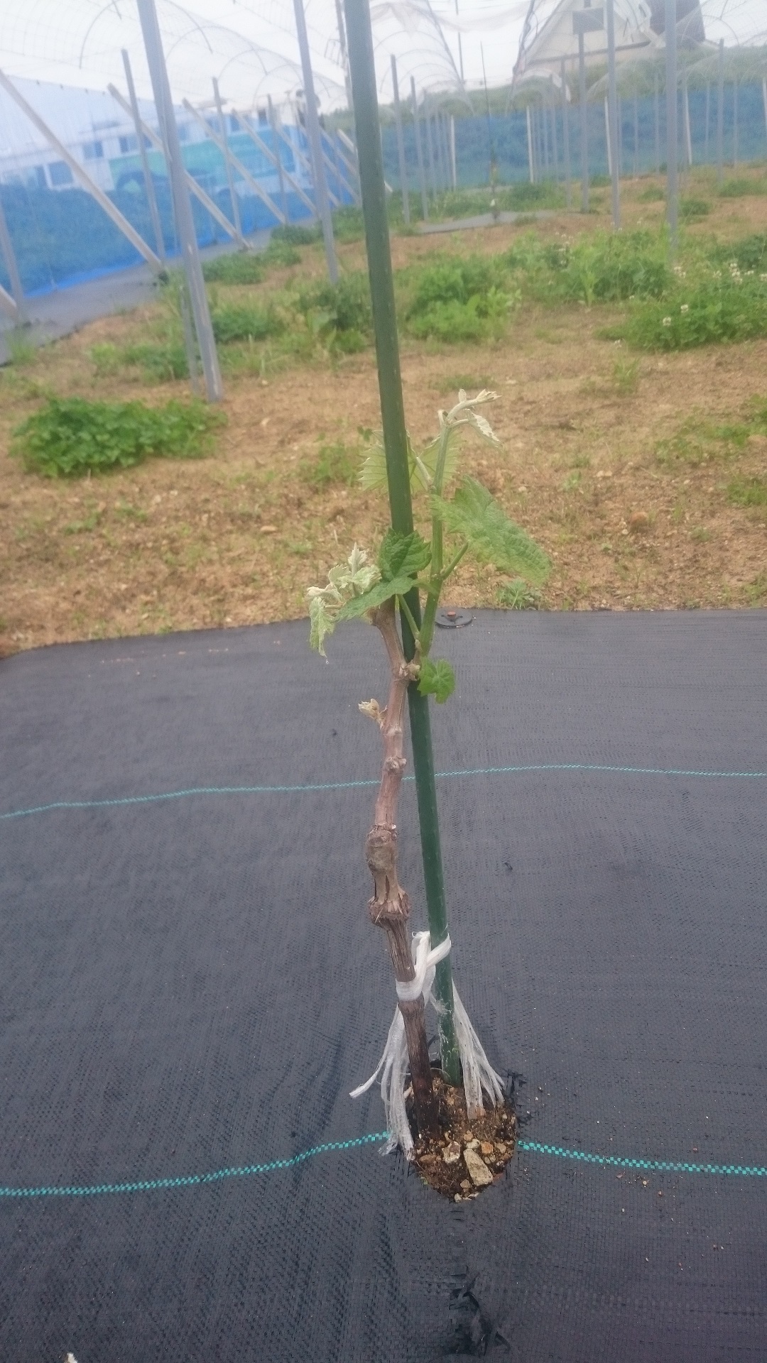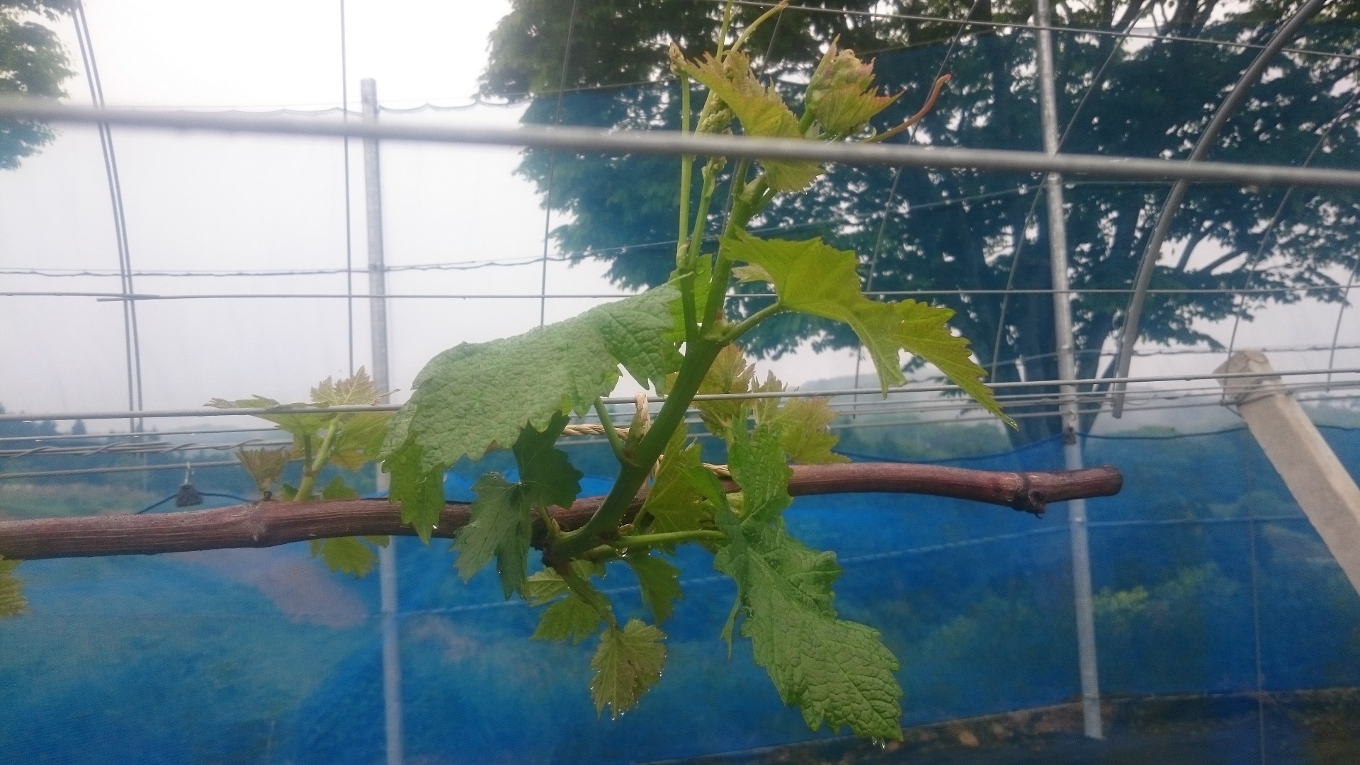 ほとんどの芽が発芽して、展葉しています。見た限りでは、芽とび(芽が出てほしい場所の芽が出ない)は少ないように思えますが、何か所かはまだ発芽していない芽もあり、なんとか芽が出てほしいものです。