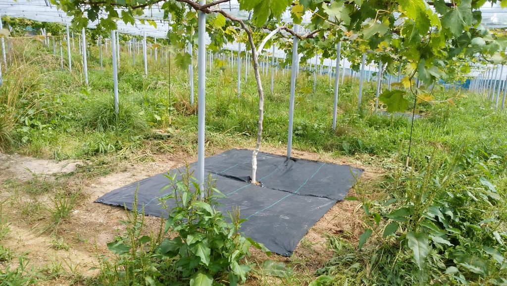 樹の周り防草シートは、まずシャイン園に設置しましたが、ピオーネ園の大が残っており、本日で完成しました。