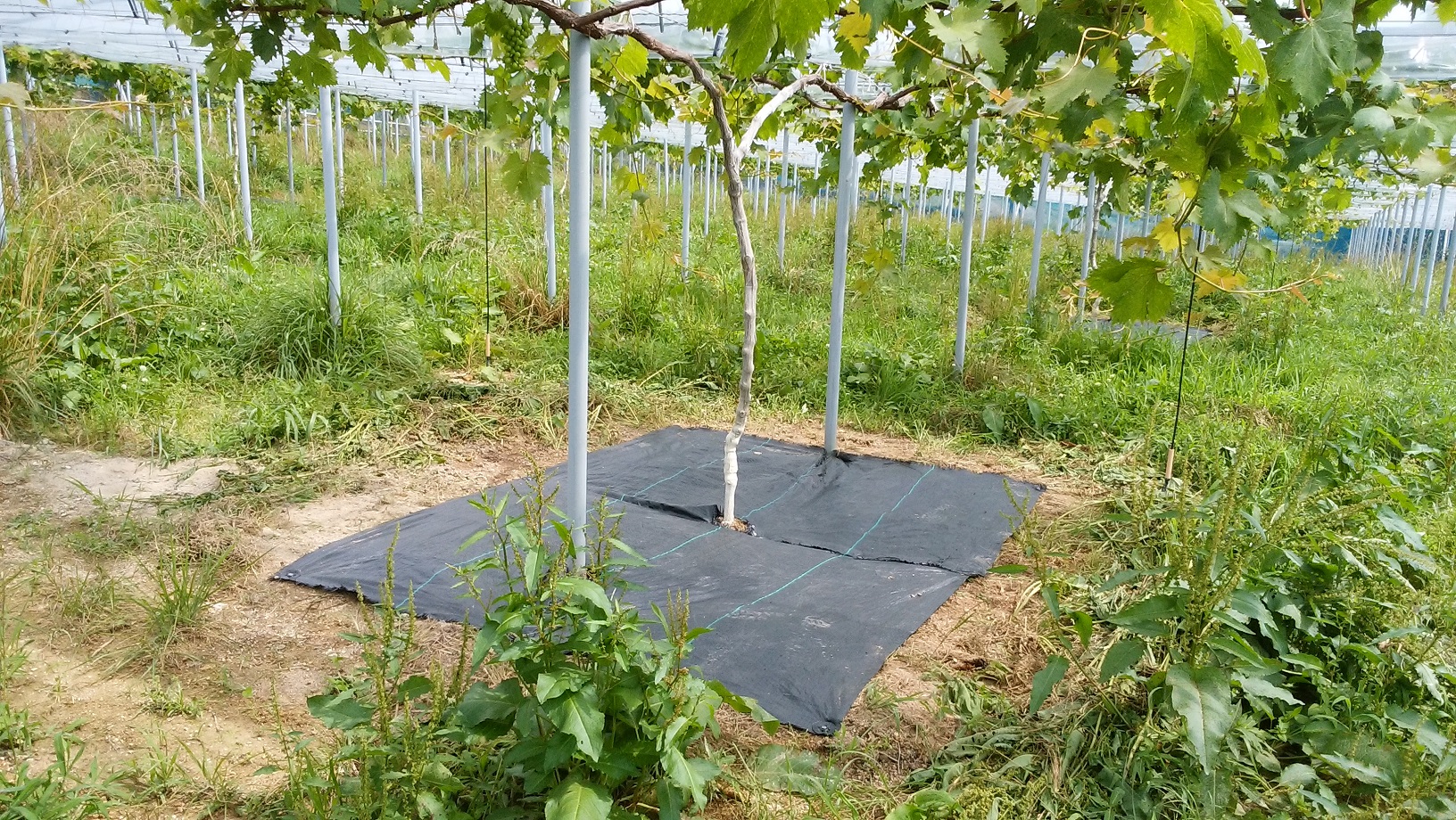 樹の周り防草シートは、まずシャイン園に設置しましたが、ピオーネ園の大が残っており、本日で完成しました。