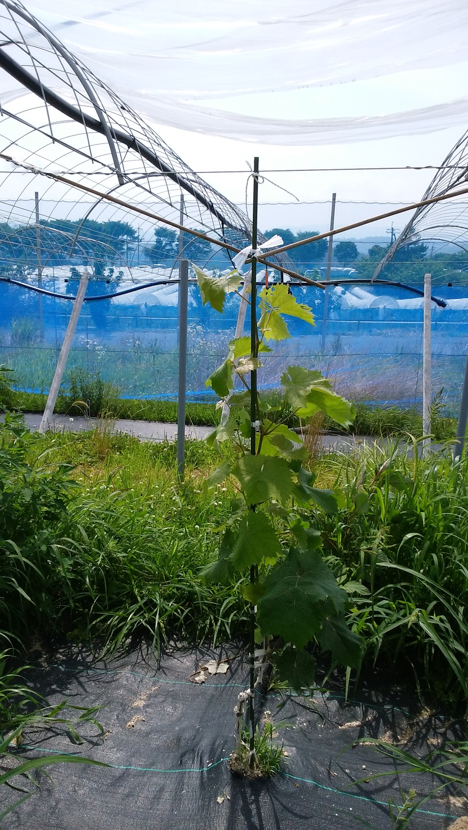 シャイン園の苗も棚面まで成長し、先日切り戻しました。これからは主枝候補の2つの芽を伸ばして誘引するためのV字型の支柱を設置します。