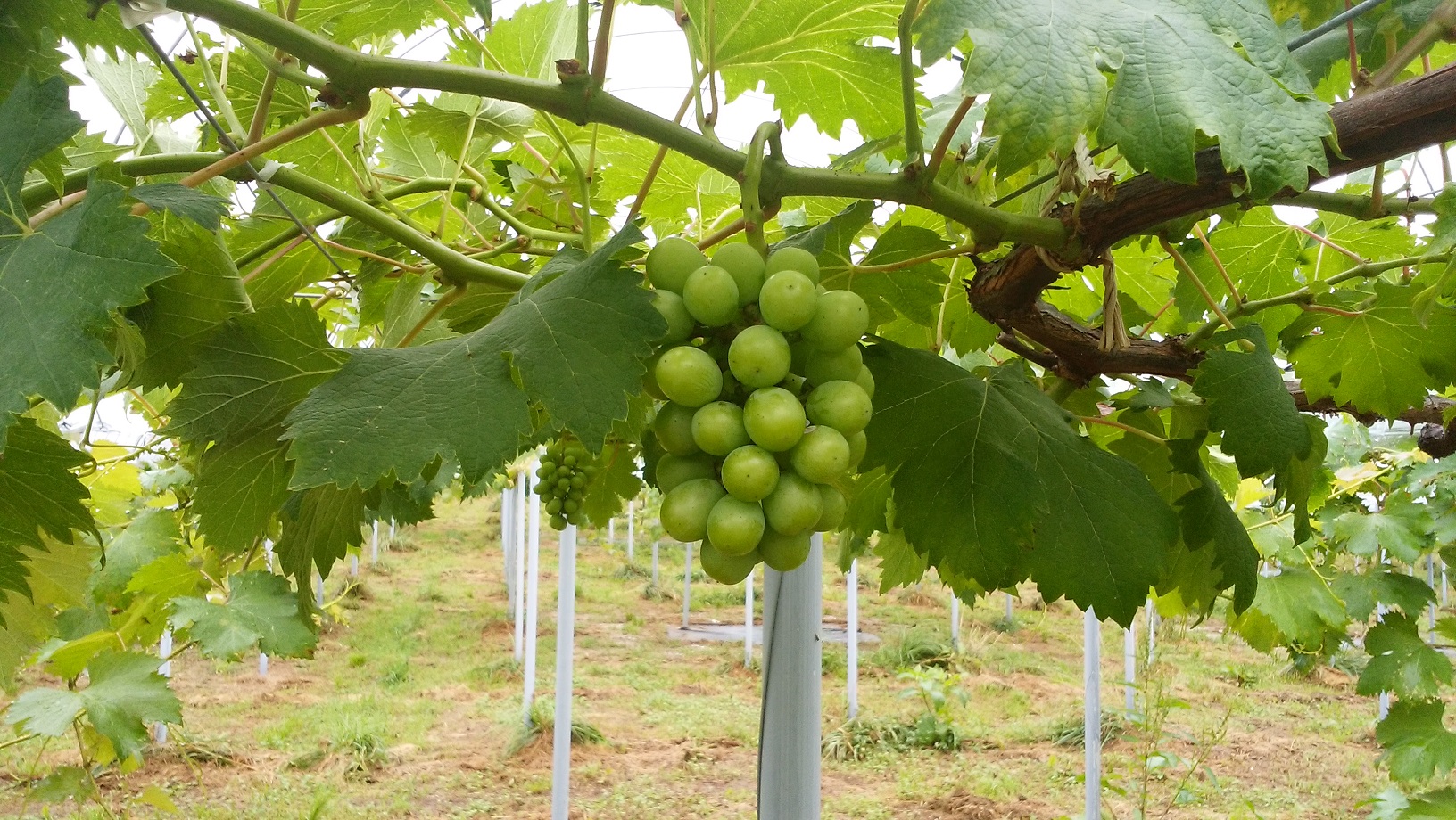 枝管理は、残り2列の先端の誘引、成長の遅れた房を落とし、込み合っている房を摘粒します。