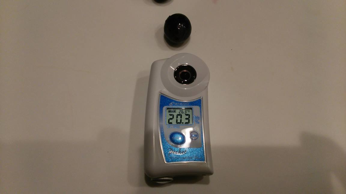 鳥獣害にあったピオーネの糖度を確認。