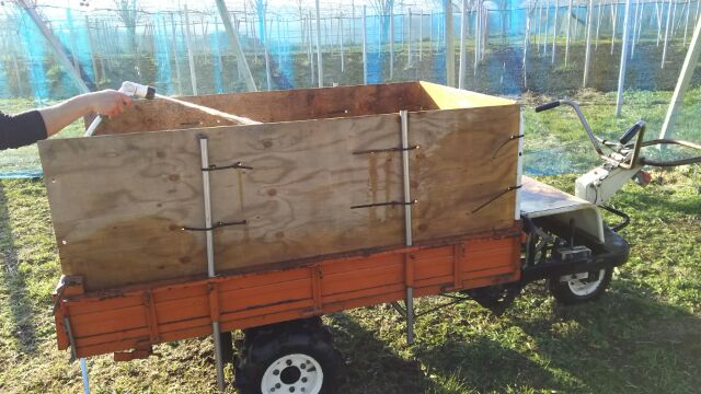 土や堆肥を運ぶ運搬車もやはり汚れていますので、座席や荷台に水をかけ、こすって清掃していきます。
