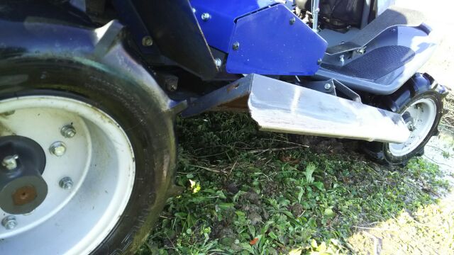 乗用草刈機に水がかかってもエンジンに支障はないので、全体に水をかけ、ペダルやタイヤをキレイにします。