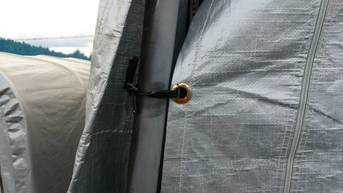 暴風で飛ばないようにマイカ線で固定する。