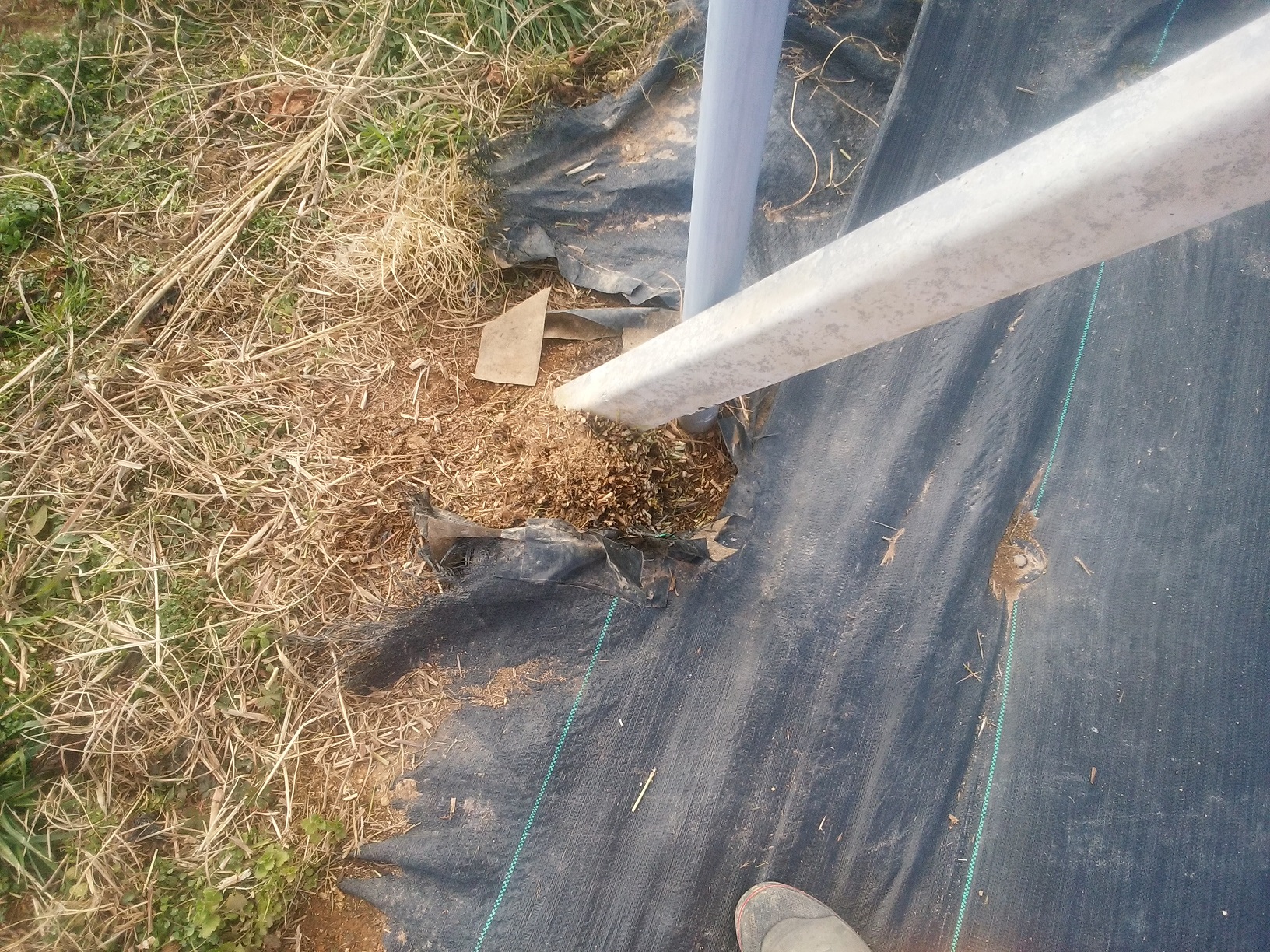 支柱側は切れ目の幅が広がっており、テープのみでは強度も弱く、テープの使用量も大幅に増えるため、防草シートを小さく切って、テープで留めたいと思います。