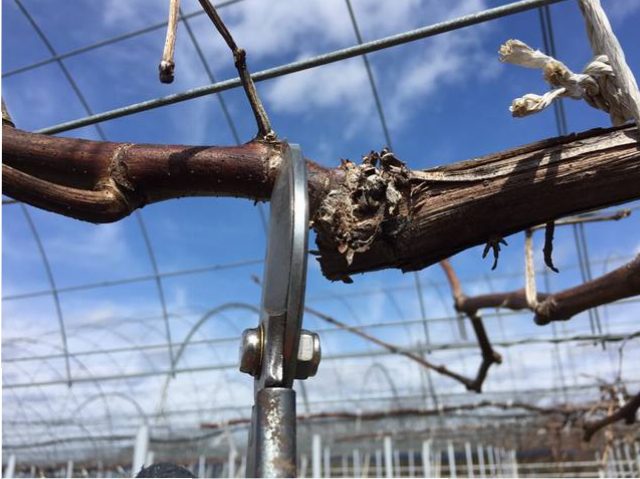 1つの芽座から2本の新梢を伸ばし、結果枝を確保する。