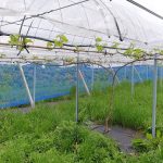 しかし、園の周囲に撒くのも病害虫の発生源になりかねないので、粉砕機の排出口に袋を付けて園外の穴に埋めることに。