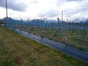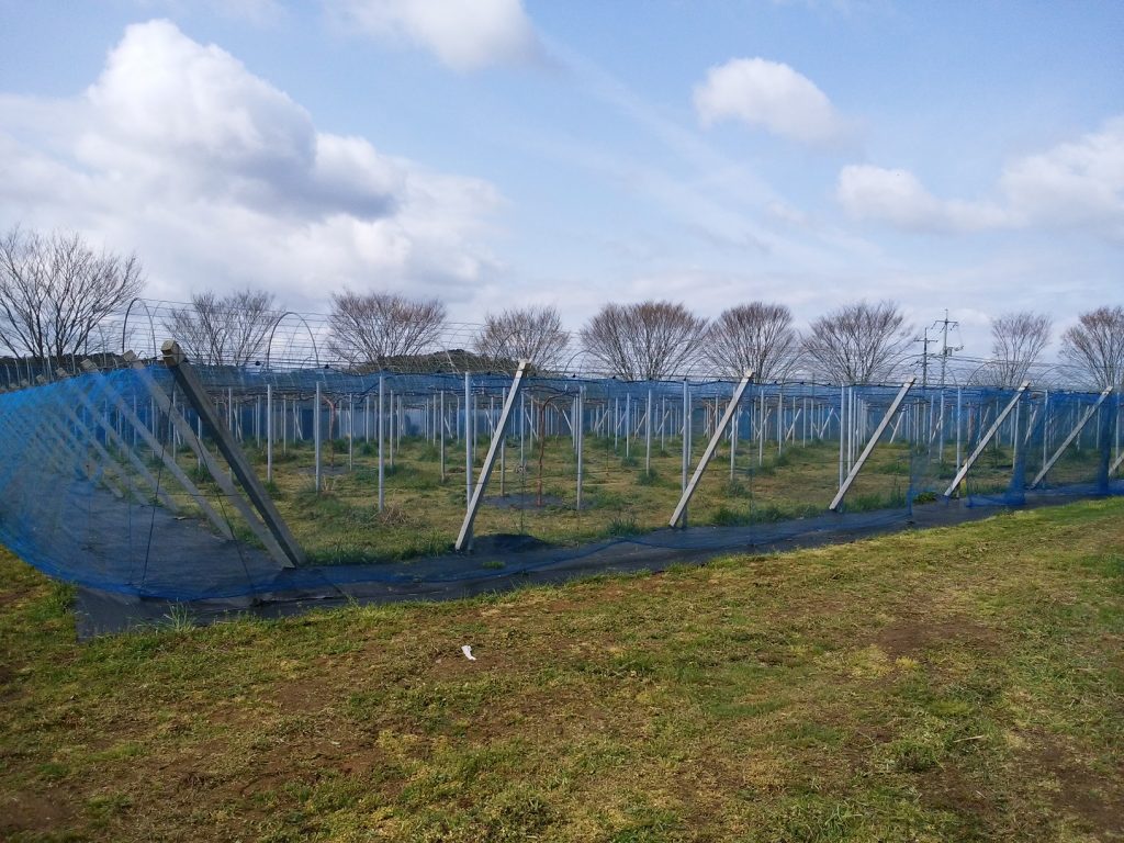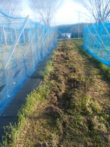 園内外の草刈り。防風ネットを降ろす。ネットを降ろすと園の雰囲気が変わります。