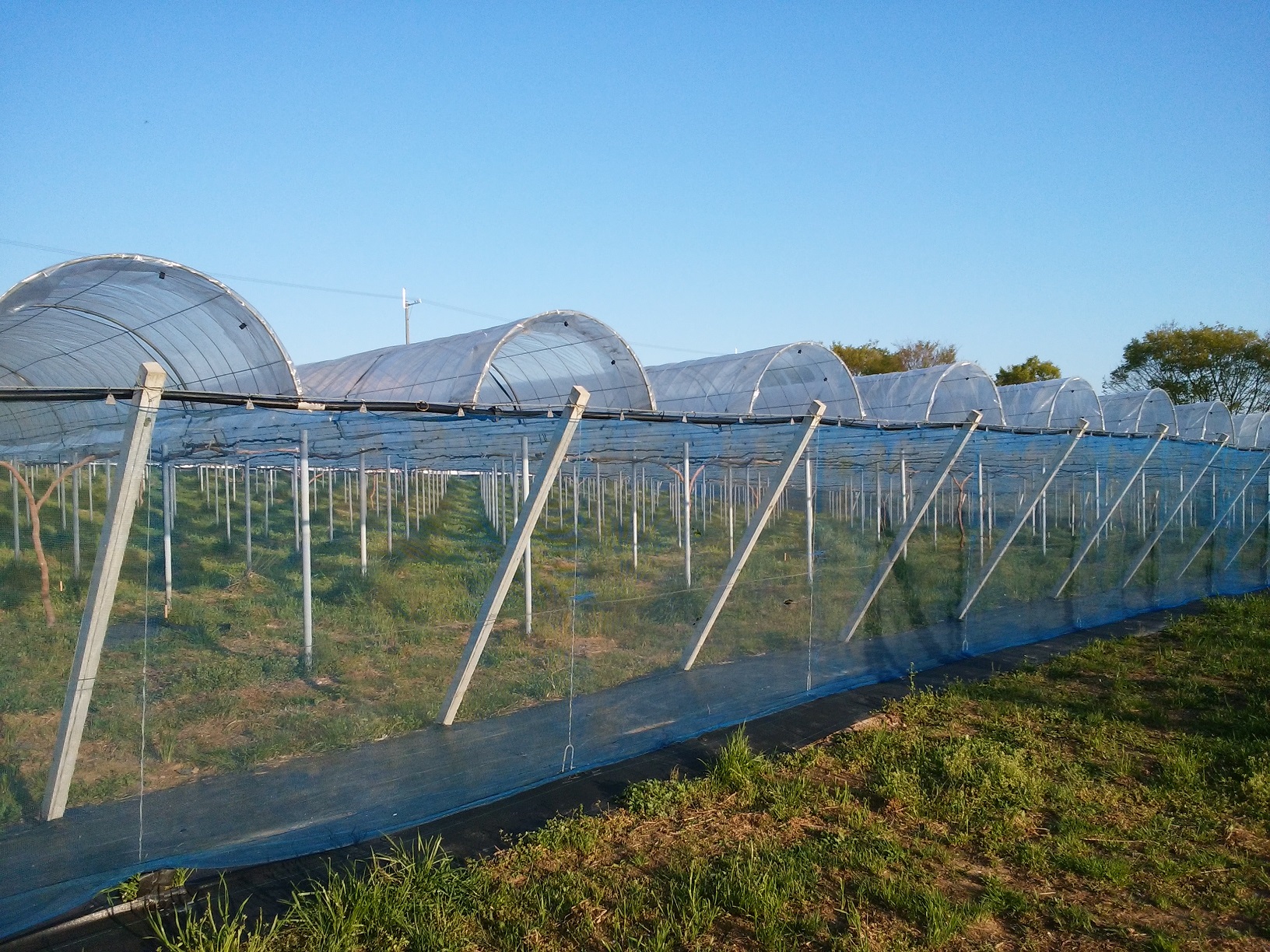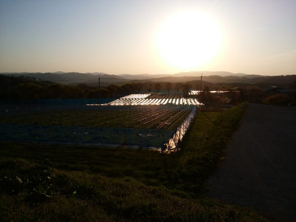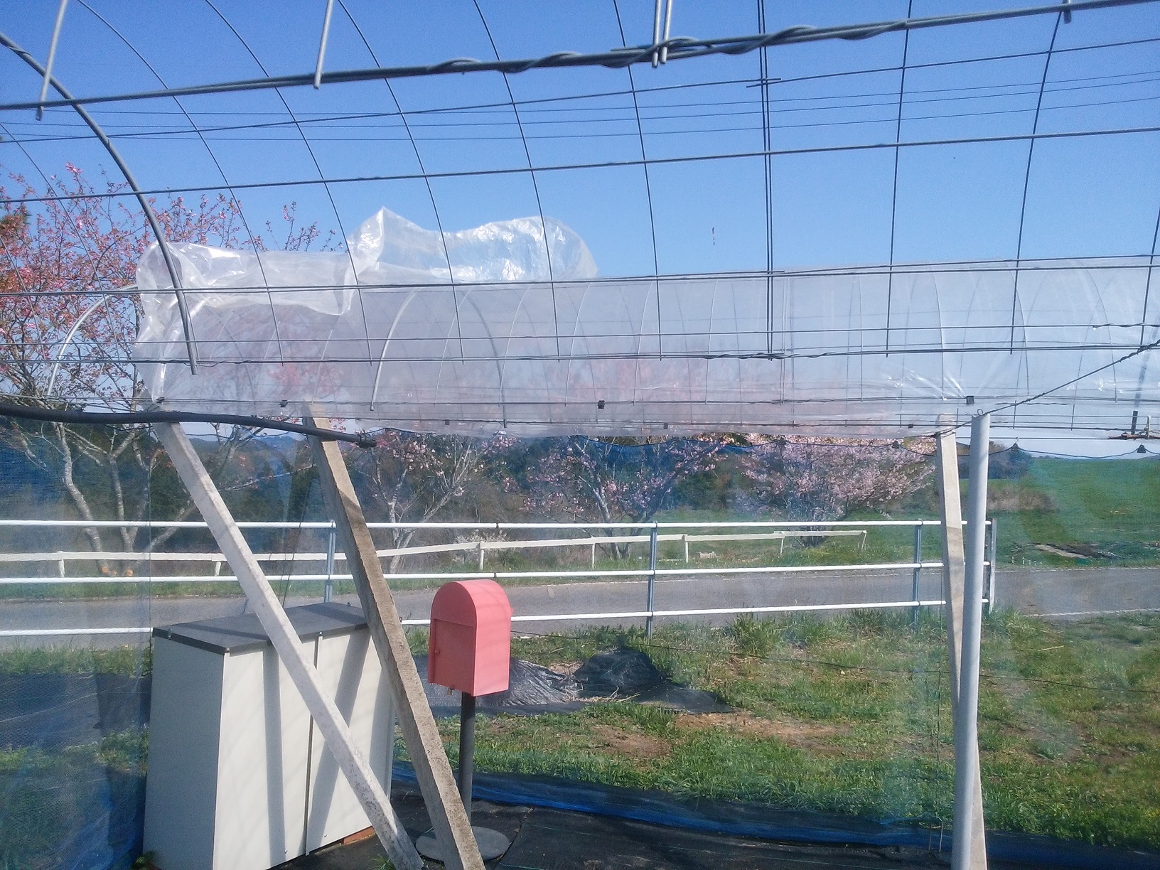 本日の作業はトンネルのビニール張り。 4名で10時からスタート。 風に対してはマイカ線が有効で、クリップで留める個所を少なくなることにしました。 1個所少なくしただけですが、大分作業が楽になりました。 規模が大きくなると1工程省くだけで大幅な省力化になります。 本日はピオーネ大園とピオーネ小園の半分まで完了。 明日は小園の残りと今年初めて張るシャイン園の作業です。