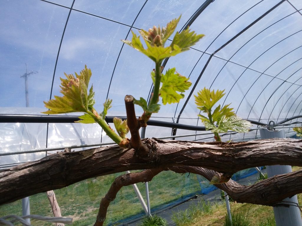 芽が伸びて新梢になると、作業し易いようにワイヤーに新梢を誘引します。ピオーネは誘引時に折れやすいのが特徴です。
