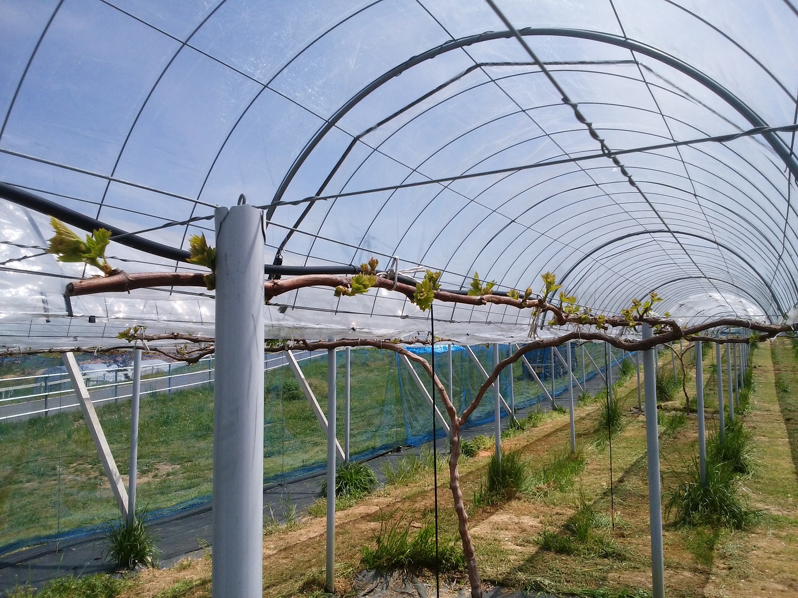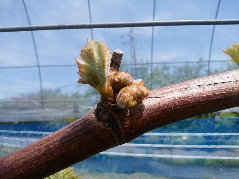 芽が伸びて新梢になると、作業し易いようにワイヤーに新梢を誘引します。ピオーネは誘引時に折れやすいのが特徴です。