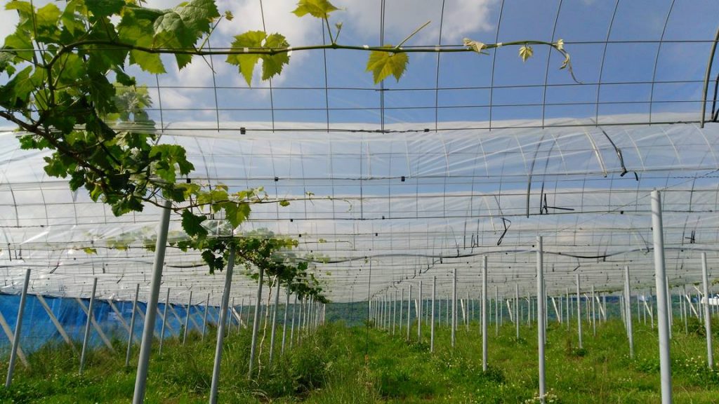 シャインマスカット枝管理で8本主枝誘引後の成長。