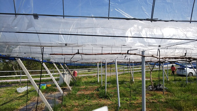 本日の作業は、トンネルのビニール張りです。雨を防ぎ、病気から木を守ります。