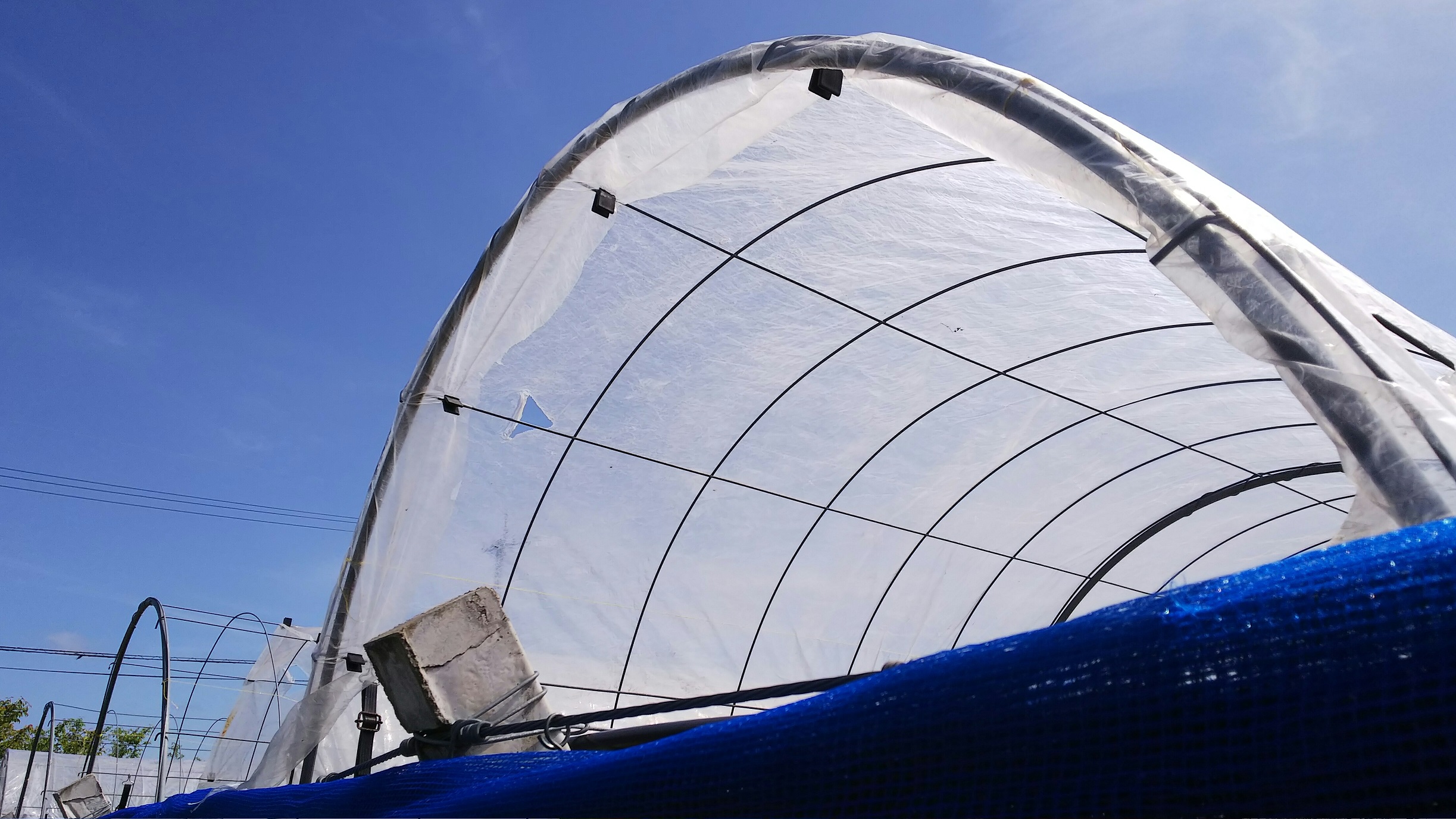 大は4人1チームでビニールを張り、1人はマイカ線を太いパイプの所に掛けていきます。トンネル両端は風が抜けるためマイカ線は不要。マイカ線を掛けるとき、ビニールをワイヤーに噛ましてから固定しないと風でめくり上がります。