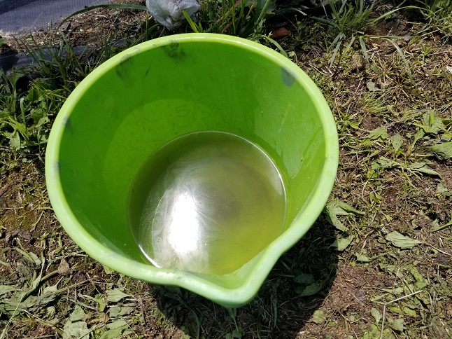 まずは冬の間にタンクの中が凍ってしまわないように、不凍液を入れているのでバケツに抜き取ります。