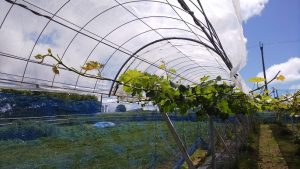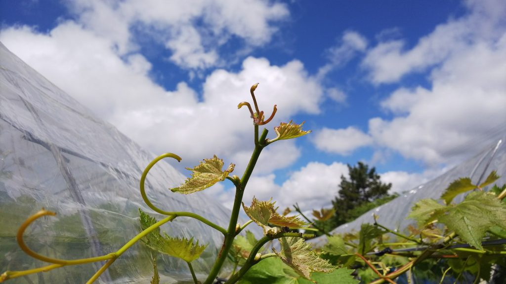 花穂整形を前日までに終了、新梢の先端を摘心します。トンネルから出ている新梢の先端を手で摘みます。