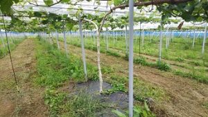 シャインは3年目のため、主枝1本の片側につき花穂2個、樹1本につき16個、シャイン20本全体で最大320個。