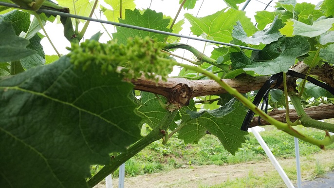 開花時期がピオーネに比べて遅めのシャインマスカットのジベレリン処理。