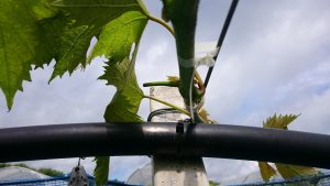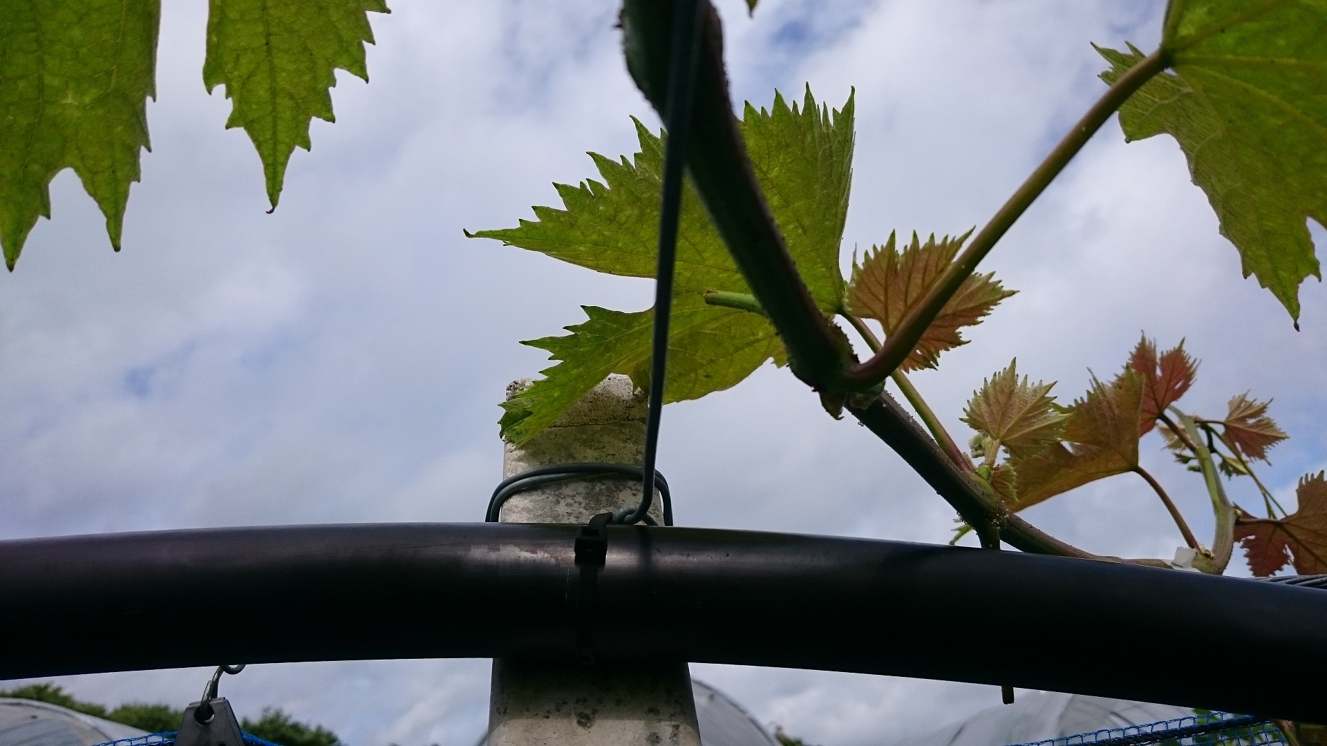 ピオーネとシャインマスカットの延長枝先端誘引を行う。 誘引前