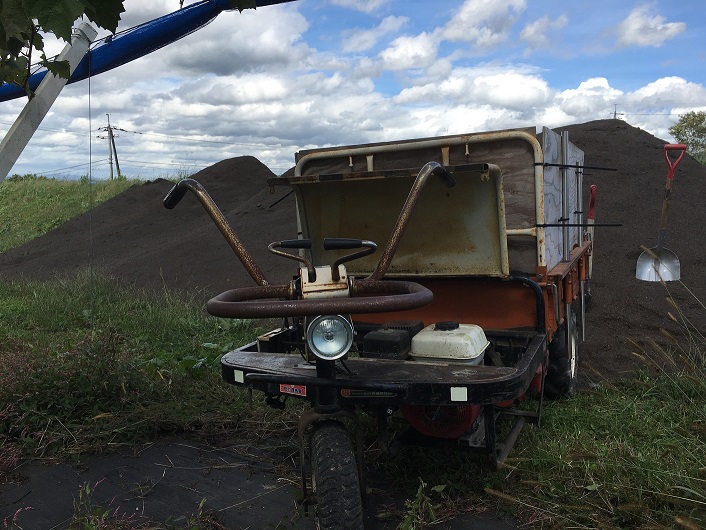 劇的に早くなる訳ではないが、3人だと堆肥の運搬車への積み込みは素早く行える。 運搬車のダンプやタイヤに巻き込まれないように安全優先。